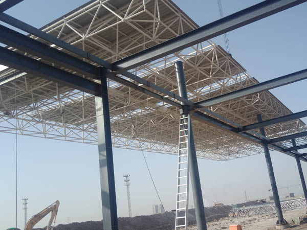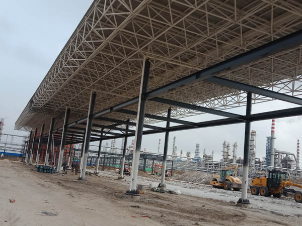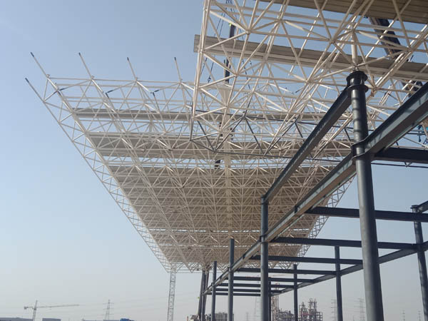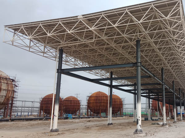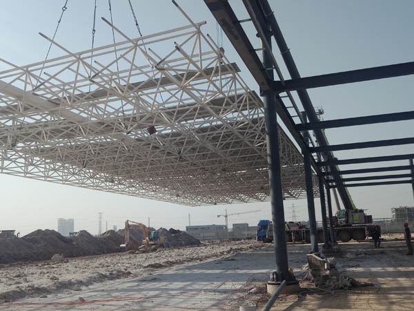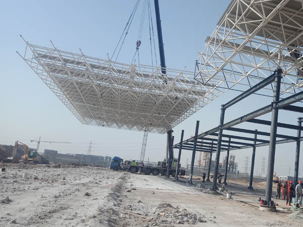 河北鑫?;ぞW(wǎng)架,長度280米,寬度16米,整體分四段進行吊裝,20天工期順利完成。