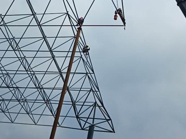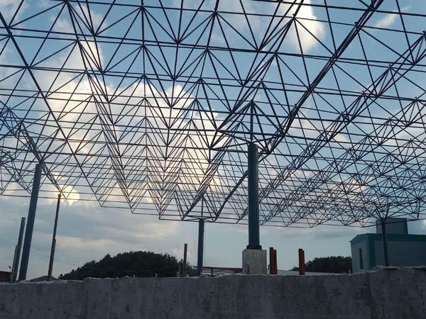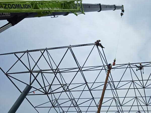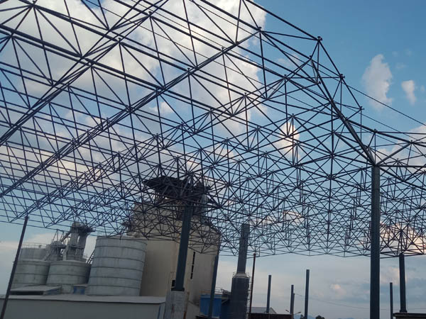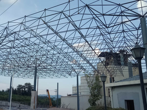 安徽青陽爐料料場網(wǎng)架工程,現(xiàn)場地形情況復(fù)雜,高低柱差12米,網(wǎng)架為多邊形,面積16326平方米,施工難度大,歷經(jīng)45天,網(wǎng)架順利安裝完畢