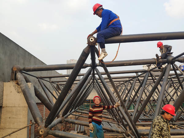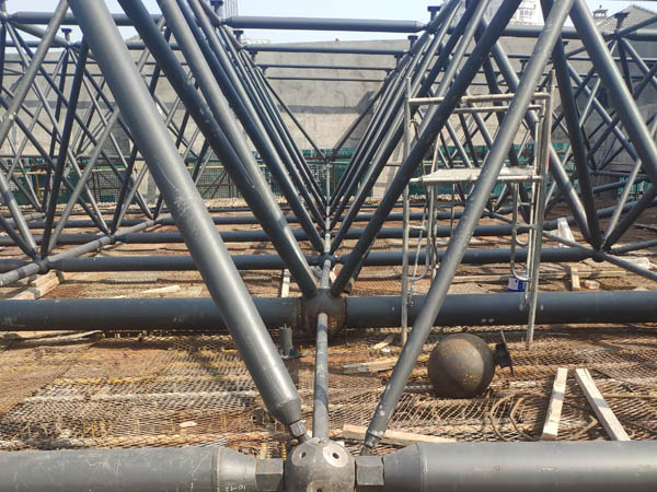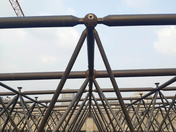 杭州城市花園酒店宴會(huì)廳,螺栓球節(jié)點(diǎn)與焊接球節(jié)點(diǎn)組合網(wǎng)架,面積3900平方米,下弦吊頂荷載240公斤,網(wǎng)架矢高3米,網(wǎng)架用鋼量60公斤一平方,施工難度非常大,藍(lán)海人用35天時(shí)間,順延完工。